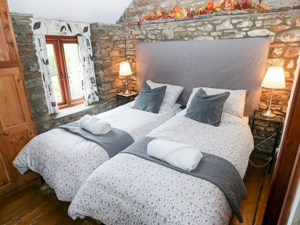 Glas Studio, a first-floor studio-style apartment, consists of a twin beds, kitchen with induction hob, fridge with ice box, microwave, air fryer, toaster, kettle, dining area and sitting area with woodburning stove and TV, serviced by a shower room with walk-in shower basin and WC. There is a shared small gym and shared laundry room on request with owners. Outside there is a private terrace with furniture, enclosed communal area with garden furniture and off-road parking for 1 car. Well-behaved pets welcome, but sorry, no smoking. You'll find a shop in 0.5 miles and a pub in 0.7 miles. WiFi, fuel, power, bed linen and towels are all included in the price. Glas Studio is a charming base for exploring Rhondda Cynon Taf. Note: There are steps up to the property. Note: There is a Good Housekeeping Bond of 75 GBP. Note: Check-in up until 9pm. Note: Livery available. Note: Dogs must be kept on a lead and under control at all times as there are farm dogs on-site.