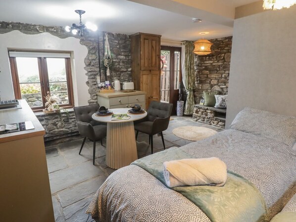 Gwyn Studio consists of a kitchen with an induction hob, microwave, fridge/freezer box, air fryer, toaster and kettle, a dining area with seating for two, and a sitting area with Sky TV including movies and sport. The bedroom offers twin beds, serviced by a shower room with walk-in shower, basin and WC. Outside, there is a communal area with garden furniture, a small gym, and off-road parking for one car. Well-behaved pets welcome, but sorry, no smoking. You'll find a shop in 0.5 miles and a pub in 0.7 miles. WiFi, fuel, power, bed linen and towels are all included in the price. Gwyn Studio is a welcoming base for exploring Rhondda Cynon Taf. Note: There is a Good Housekeeping Bond of 75 GBP. Note: Check-in up until 9pm. Note: Livery available. Note: Dogs must be kept on a lead and under control at all times as there are farm dogs on-site.