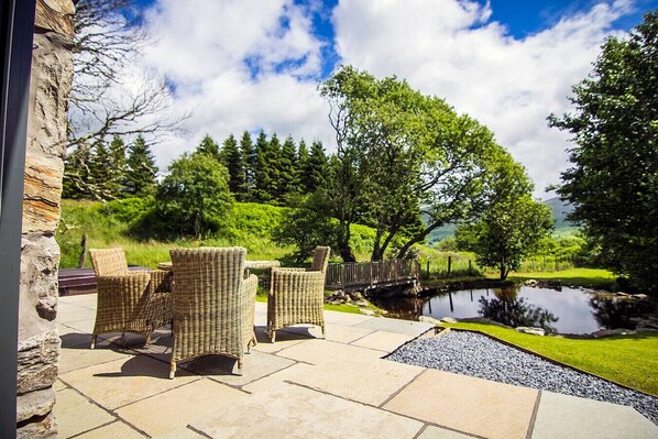 Welcome to Wishing Well Cottage, an exquisite eco-friendly retreat nestled within the expansive 40-acre Craggantoul Estate in Highland Perthshire. Surrounded by rolling meadows, ancient oak forests, a private pond, and stunning scenery, this secluded cottage offers a perfect escape into nature’s tranquility. Designed with modern luxury and sustainability in mind, Wishing Well Cottage is ideal for romantic getaways, family breaks, or those seeking a peaceful retreat amid spectacular landscapes. Open-Plan Living, Dining & Kitchen: Step into the spacious, open-plan living area, beautifully designed with large windows that frame views of the estate and private pond. Relax on comfortable sofas, listen to music with the Bluetooth hi-fi system, or watch your favourite shows on the flat-screen LED TV with DVD player. The dining area’s table comfortably seats four, overlooking the lush surroundings, while the sleek kitchen boasts a contemporary design with integrated appliances, a large worktop, and all the mod cons needed for effortless self-catering. Master Bedroom & En-Suite Bathroom: The luxurious master bedroom features a king-sized bed with a memory foam mattress, dressed in crisp white cotton linen, complemented by beautiful White Company throws and cushions. Large windows offer serene views of the garden and estate, perfect for waking up to the beautiful surroundings. The ensuite bathroom includes a walk-in power shower, freestanding bath, a heated towel rail, luxury toiletries, and plush bath sheets, creating a relaxing space to start or end your day. There are stunning French doors with views out to the garden overlooking the pond, which gives convenient access to the hot tub. Second Bedroom & En-Suite Bathroom: The second bedroom is equally stunning, with twin beds fitted with memory foam mattresses, also topped in white cotton linen with elegant throws and cushions. Its ensuite bathroom boasts a walk-in shower, heated towel rail, and luxurious towels. Both bedrooms have flat-screen TVs, ensuring comfort and entertainment for all guests, while providing privacy and restful nights in a tranquil setting. Outdoor Space & Features: Step outside into the private garden, where a spacious patio offers outdoor dining and relaxing with panoramic views of the estate’s lush pond and woodland. The outdoor hot tub invites you to unwind while soaking up the peaceful scenery, and the private pond running through the property adds to the charming, natural atmosphere. Outdoor furniture makes this the perfect spot for evening drinks or morning coffee in the fresh Highland air. Additional Amenities & Estate Highlights: Wishing Well Cottage is equipped with underfloor heating, a fully stocked modern kitchen, free Wi-Fi, books, DVDs, and eco-friendly features including solar-panel roofing. Explore miles of woodland trails, enjoy trout fishing rights on Loch Tay’s frontage, or relax by the duck pond on the estate. Private parking is available, and the nearest pub is just one mile away, with Killin village 7 miles from the estate. Please note, pets & raucous parties are not permitted to maintain the tranquility of this special environment.