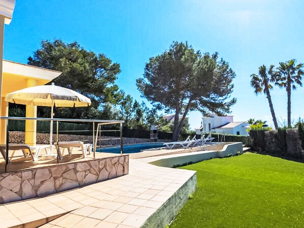 Son Bou: Large, cosy, comfortable villa "Llebeig 155", built in 2002. Residential area (villas), 1 km from the sea, 1 km from the beach. Private: beautiful garden to relax, swimming pool angular (4 x 6 m, depth 100 - 200 cm, seasonal availability: 01.Mar. - 31.Oct.). Outdoor shower, patio, pergola, garden furniture, barbecue. In the house: internet access, WiFi, air conditioning, washing machine. Public parking on the road. Bus stop 1.5 km, sandy beach "Son Bou" 1 km. Please note: car recommended. Baby equipment on request (included). Object suitable for 6 adults. The owner does not accept any youth groups. Loading and unloading of baggage is possible at the holiday house. Airfield 21 km from the property. "Llebeig 155", 4-room villa 157 m2. Object suitable for 6 adults. Spacious and bright, tasteful and cosy furnishings: living room with flat screen, air conditioning and forced-air heating. Exit to the patio, to the swimming pool. 1 double bedroom with 2 beds (90 cm, length 200 cm), bath/bidet/WC. 1 double bedroom with 1 french bed (150 cm, length 200 cm), shower/WC. 1 double bedroom with 2 beds (90 cm, length 200 cm). Kitchen-/living room (oven, dishwasher, 3 ceramic glass hob hotplates, toaster, kettle, microwave, freezer, electric coffee machine) with bar, dining table. Bath or shower/WC. Terrace. Terrace furniture, barbecue, deck chairs (6), covered balcony. View of the sea, the swimming pool and the countryside. Facilities: washing machine, iron, children's high chair, baby cot for up to 2 year olds, hair dryer. Internet (WiFi, free). Suitable for families. VTV276ME // Reg. Nr.: ESFCTU000007013000381256000000000000000000VTV-276-ME3