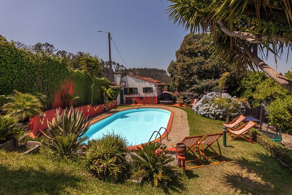 Travelers find peaceful escape in the Big Sunny Triple Bedroom at Casa da Avó - Vale da Silva Villas near Aveiro. The room includes a private bathroom, while the property grounds invite guests to swim in the pool, enjoy table tennis, or explore the surrounding nature on bicycles.