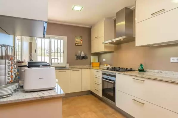 The exteriors ensure the rest we deserve on these holidays. The terrace under the vineyard is perfect for a drink at sunset and, next to it the porch where you can taste a delicious barbecue admiring the wonderful views of the fields. You can also enjoy the sun on the sun loungers and the wonderful starry sky on the top terrace. The property is fenced and privacy is total. The house consists of a single floor with a rustic and cozy atmosphere. The living room offers a comfortable sofa, TV, AC, and a wood stove and another pellet stove for colder days. Next is the dining room where you can enjoy delicious dishes cooked in the gas kitchen of the modern kitchen. The laundry room is independent and has a washing machine, dryer, iron, and ironing board. In the house, there are two bedrooms with a wardrobe and a fan, one with a double bed and the other with a single bed. If you are traveling with your baby, we can provide a crib and a high chair. A bathroom with a bathtub completes the accommodation. The property is located on the outskirts of Algaida, a small town in the centre of the island that will allow you to learn about its traditions while offering all the necessary services for an independent stay. You can visit the area of Randa and the Santuari de Cura. If you like golf, the Son Gual course is 11.4 km away. If you want to go to the beach, you have infinite possibilities: you can go to el Arenal, also to the natural beach of Es Trenc or Sa Ràpita. A car is necessary to move around. The highway is nearby, so you can reach many beautiful spots on the island. Consult the advertiser for possible charges. Pets are not allowed. The holding of events is forbidden. There is exterior parking for 6 cars. Distances Beach: 21.8 km - El Arenal Airport: 22.7 km - Son Sant Joan Golf course: 11.4 km - Golf Son Gual Town: 2.9 km - Algaida Train station: 22.6 km - Palma de Mallorca Bus stop: 1.4 km - Algaida Ferry: 26.9 km - Palma de Mallorca Hospital: 26 km - Hospital Universitari Son Espases Tourist license: ETV/13106There's a mandatory tourist tax in Balearic Islands, called Ecotasa. All guests, except people under 16 years, have to pay this tax. The amount varies between 0.55€/night and guest during the low season and 2.2€/night and guest during the high season .The tax is reduced by half from the 9th day for your stay.