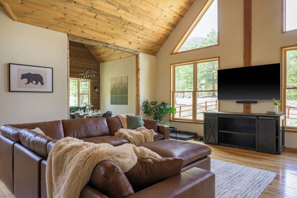 Nestled in the mountains, Pines & Peaks offers a serene retreat. Unwind by the wood-burning stove, sip coffee on the deck, and soak up panoramic views of snow-capped peaks. With a hot tub and proximity to Rocky Mountain National Park and Estes Park nearby outdoor adventures await.