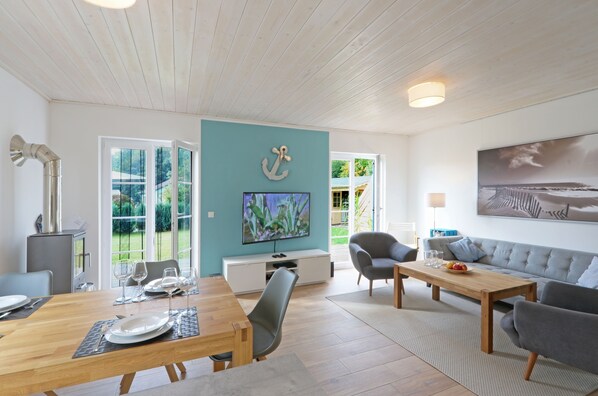 The 3 bedrooms are equipped with box spring beds and in the large bedroom there is a 2. TV. The bathroom on the ground floor has a spacious, floor-level rain shower, in the upper bathroom you can relax in the bathtub. The great eat-in kitchen offers plenty of space for family and friends and the kitchen is fully equipped.