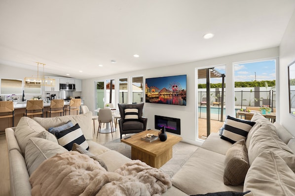 Spacious Living Area: • Modern & Elegant: Newly designed with a luxe modular sectional sofa, a sleek electric fireplace, and stylish decor throughout. • Entertainment Central: A large flat-screen smart TV creates the perfect setup for movie nights or relaxing downtime. • Designer Touches: Every inch of the space has been thoughtfully curated for a modern yet cozy vibe.