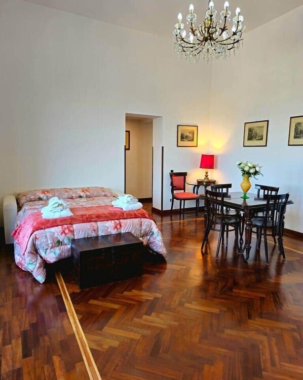 Spacious apartment on the third floor of a historic villa, featuring parquet floors and period furnishings. It can accommodate up to 10 guests in three bedrooms with lofts, two bathrooms, and a large living room with a four-door balcony overlooking Mount Vesuvius. Windows and skylights offer spectacular views of Naples, Sorrento, and the surrounding mountains. A panoramic rooftop terrace and shared garden complete the experience.