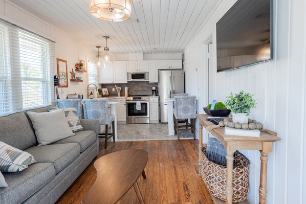 This unit was lovingly redecorated to compliment and highlight the beautifully restored original heart of pine wood floors and the original cypress wood ceilings and walls to complete the modern beach cottage look. Main features include a balcony with outdoor dining, a full kitchen, a cozy living room, and a full bathroom with a walk-in shower. Enjoy meals al fresco on the deck surrounded by green palms and a blue sky overhead. Or curl up with a book in the nook of the bright entry porch.