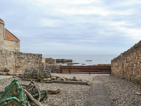 Bathroom: Bath With Shower Over, Heated Towel Rail, Toilet. Electric central heating, electricity, bed linen, towels and Wi-Fi included.. Shared, enclosed courtyard with sitting-out areas and garden furniture. On road parking. 2 well-behaved dogs welcome. No smoking. Please note: There is 1 step up to the garden.. With magnificent sea views, and ideal for a couple, discover this delightful ground floor holiday apartment, in one of the most historic and picturesque areas of Fife, with pretty fishing villages, beautiful beaches and coves. Situated in the heart of the conservation village of Cellardyke, just a few steps from the shore, explore the quaint wynds and lanes, the old fishing port lined with charming houses, and unspoilt scenery on foot from the front door. The Fife Coastal Path passes through the village towards Crail and St Andrews in one direction, and Pittenweem, St Monans and Elie in the other direction, and there is a regular coastal bus service. From the comfort of the shared south-facing garden, you can wonder at the wildlife, follow the fishermen bringing in their daily catch, or just while away the hours with a good book and a glass of wine. Visit St Andrews 10 miles away, and Edinburgh, Stirling and Perth all within an hour’s drive.