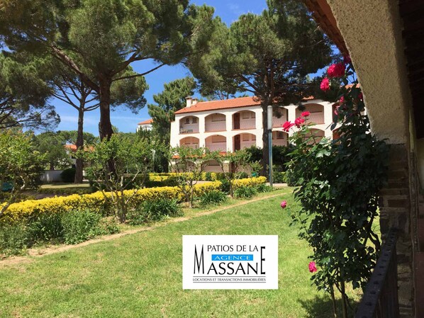 In a wooded park of 3ha, swimming pools, tennis, about 250m from the beach, near the shops, in a very pleasant area, public parking free all around the residence