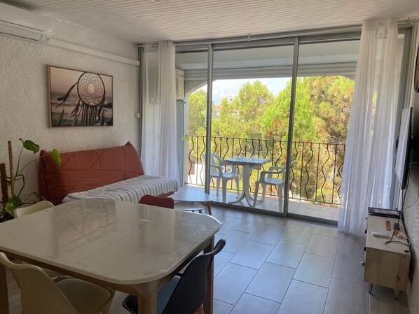 LIVING ROOM: 1 140cm sofa bed, TV, (washing machine + microwave in cupboard), balcony overlooking the small street and pavilions