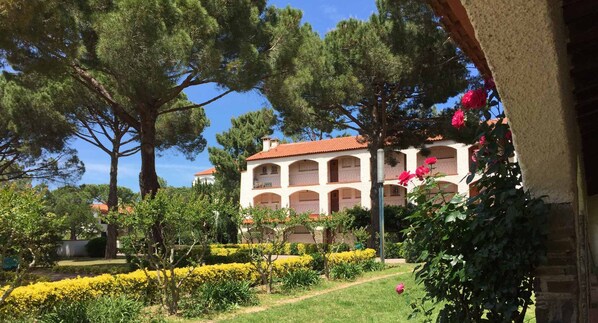 In a wooded park of 3ha, swimming pools, tennis, about 250m from the beach, near the shops, in a very pleasant area, public parking free all around the residence