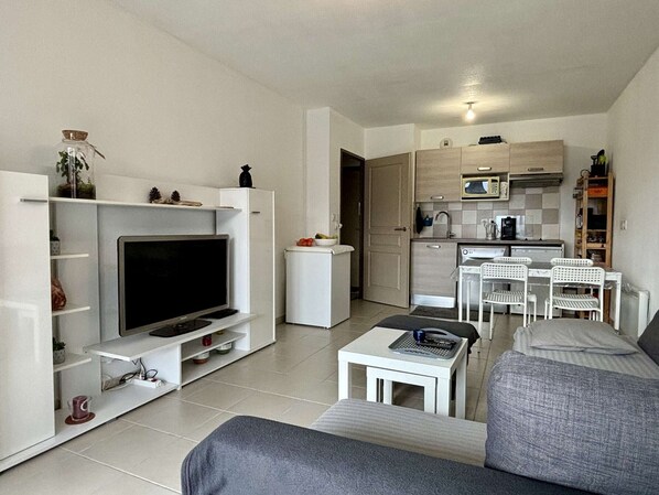 Le logement : Cet appartement de vacances comprenant deux pièces, se compose d’un séjour avec un canapé convertible deux places, d’un coin cuisine équipée, d’une chambre avec un lit en 140 et d'une salle de bain avec WC.