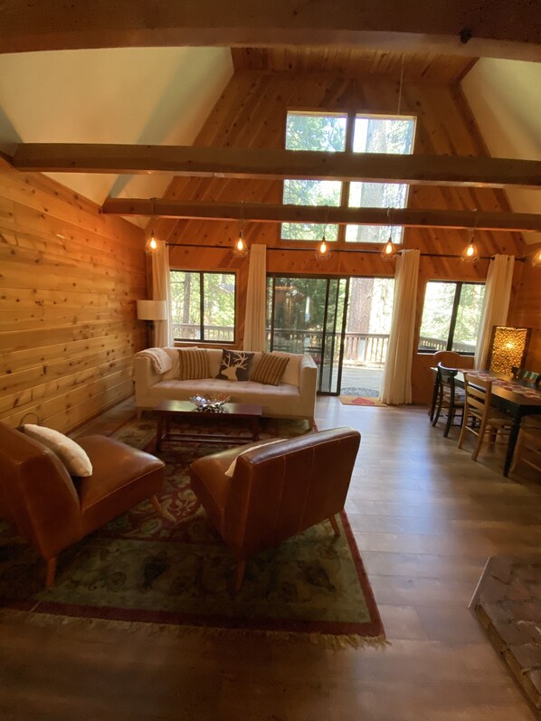 The cabin has been stylishly updated with all-new furniture, comfy beds and linens, with two queen beds in the large downstairs bedroom and three full beds in the upstairs loft. The living room is equipped with a 55" TV and the loft and first floor bedrooms have additional TVs. The kitchen is well-equipped with a Nespresso machine, a Keurig and a traditional coffee maker, electric range, toaster, blender, microwave, new refrigerator and dishwasher, Nutribullet and everything you'll need to cook a delicious meal. There are full baths upstairs and one the main floor and a washer and dryer. Outside, you'll relax on the wrap-around deck, surrounded by dense redwoods and pines. Grill a yummy dinner on the Weber gas grill or soak in the spa after a fun-filled day of adventure and activities. The home is equipped with plenty of games and puzzles to enjoy and an Alexa blue tooth speaker to listen to your favorite songs or podcasts, catch up on the news, and much more. Relax and have fun!