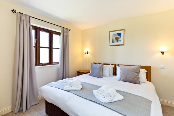 Bedroom 1 - super king or twin beds & TV, plus en suite shower. Bedroom 2 - king or twin beds Family bathroom. Open plan lounge/kitchen/dining with French doors opening out onto a decked balcony with outdoor seating.
