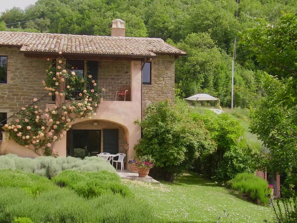 Casa Rosa is a traditional stone farmhouse set high in the green hills of Umbria, some ten kilometres (or six miles) north-east of Assisi. The house is divided into self-catering apartments – one large holiday apartment occupying the entire of the first floor of the original farmhouse, two smaller apartments sharing the ground floor, a small cottage in the converted stables; a two-bedroom apartment; and a studio apartment in a new extension. Each apartment is completely self-contained, with its own kitchen and bathroom, and its own balcony or terrace.