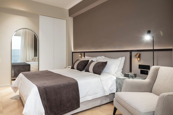 Ariadne apartment is a luxurious suite with two master bedrooms (with en suite bathrooms), a cosy and comfortable living room, a dining area and a fully equipped kitchen. There is a also a desk for your working needs and the living room is also equipped with a WC.