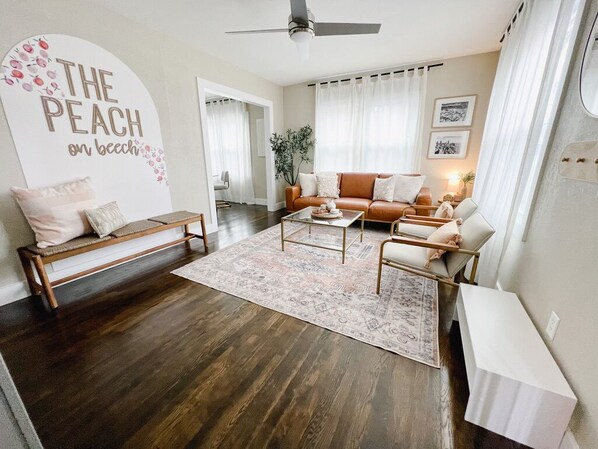 Welcome to @thepeachonbeech—our mid century modern boho inspired peach-themed house on Beech street (hence the name).