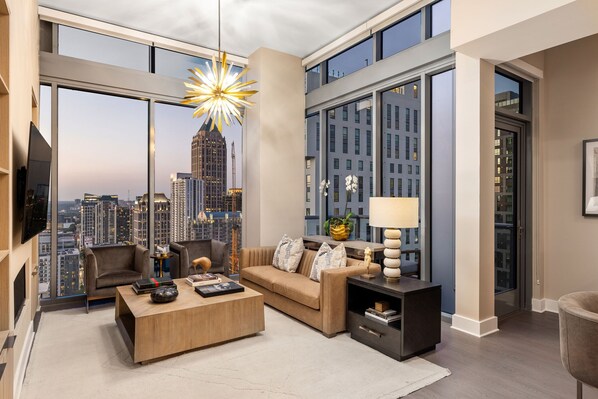 The living area exudes tranquility, where custom chandeliers cast a subdued radiance, creating a serene atmosphere. Floor-to-ceiling windows frame the entire city of Atlanta, leading to two sprawling balconies that invite you to unwind and find solace amidst the cityscape. The true highlight of the master suite is the luxurious bathtub, the main event of the unit, where you can soak while overlooking the breathtaking cityscape. With 1 GBPS Wi-Fi ensuring steadfast connectivity, you can stay connected or immerse yourself in uninterrupted entertainment. The two-bedrooms, designed and crafted with a focus on luxury and comfort, promise a rejuvenating slumber with soft tones and plush details.