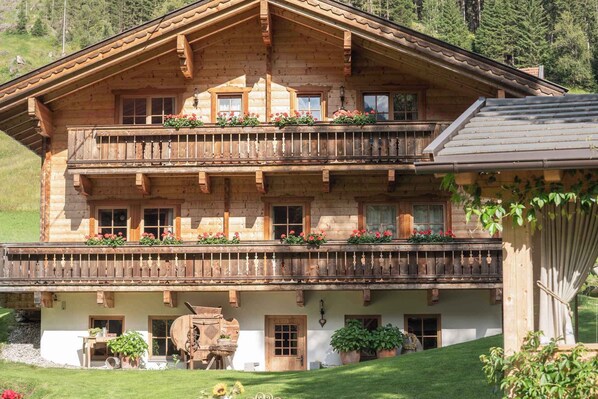 Ausservillgraten, 1378 m above sea level. The holiday home is located on a farm, on a 400 sqm open garden plot with meadow and flowers. The landlord lives in a separate building on the property. The holiday home is situated next to a lovingly restored farm that is operated as an organic farm. There you can buy products from Tyrolean Grey cattle as well as organic herbs and potatoes from their own cultivation. View of mountains and meadows. Access is via a side road (asphalted). Parking on the property.