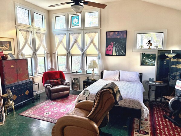 About the studio — eclectic Japanese-inspired decor. Perfect for two people. Relax on a fantastic reclining massage chair after a long day. Then curl up on a queen bed and drift off under luxurious high-thread count cotton bed linens with a down-alternative comforter. New bed upgrade in Jan, 2026. Hopefully just perfect for you — not too firm, not too soft. :)