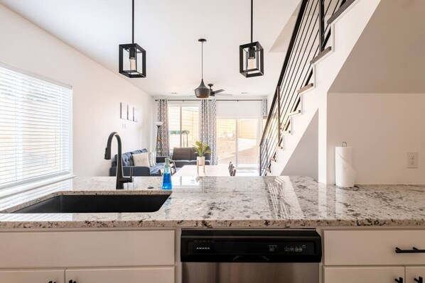 THE SPACE: - Entire townhouse, new construction, and fully furnished - 3 Bedrooms, 2.5BA - 1 king bed, 1 queen bed, 2 twin beds - Extra inflatable bed available - Lower level patio with outdoor swing - Private second level balcony in master bedroom. - Golden evening sunset view right from your bedroom window - Vaulted ceilings in bedrooms and washer/dryer downstairs. - Full kitchen with granite countertops. - Kitchen appliances and cooking utensils, everything you need to get a meal started! - Dinnerware sets - comfortably serves a group of 4 at once - Dining area with 4-seating capacity - Large grill for your smokes and BBQs! - Garage parking available - Lots of lake and golfing activities on Lake Travis and Lago Vista Golf Course just minutes away! - Guest pass to private lake amenities available upon request.