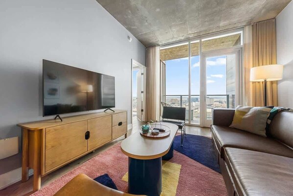 Wake up above Rainey Street in a stylish 22nd-floor condo with unbeatable rooftop pool, full gym and skyline views.