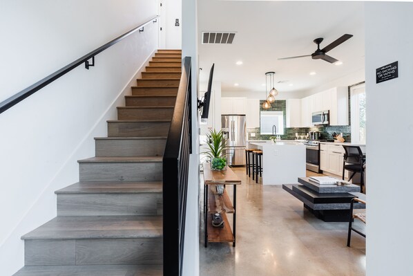 Welcome to East Austin's newest modern luxury home. This home is completely free standing & has 2 bedrooms w/ balconies & 2.5 bathrooms and sits in the back of the lot behind our main home. Additionally, it has multiple outdoor areas to relax & hang out including a roof top deck with a day bed where you can lay and gaze onto the trees above.