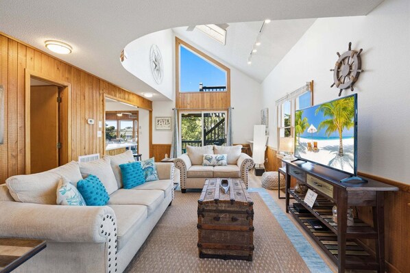 Upstairs on the main level, relax around the flat screen TV in the spacious living area with high ceilings, bright lighting, and beautiful nautical decor. Be sure to take advantage of the desk nearby to catch up on emails or do a little work during your stay. Cook up some delicious fresh, local seafood in the fully-equipped kitchen and enjoy meals at the breakfast bar. Just off the kitchen, you'll find a brightly lit, wooden-paneled sunroom that doubles as a dining area making this the perfect place to have dinner with the light of the setting sun. A queen bedroom with access to the shared full bathroom sits just off of the living area for an easy escape in the evening. The home also features a mid-level covered deck for coffee in the morning or quiet time in the evenings under the shade.