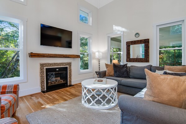 Nestled in the Maritime Forest, seemingly far away from it all, but surprisingly close to everything: two minutes to the beach or market; three to Old Baldy and the BHI Club. Though you may never want to leave the back porch. After a day or riding the waves, sink deep in the cushions with a cocktail and book and end up quietly pondering the sculptural intricacies of Live Oak trees.