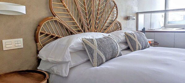 and invites you to immerse yourself in a deep tropical forest, in which the "cage" lamps with wooden bars, enclose edison bulbs that only let out their best light. Mirrors lost in wooden mazes, tables that convey the strength of the tree trunk ... the elegant design of nature is imposed while the sun shines through the window. The ensuite bathroom has a bathtub, the relaxing option to enhance all our vanities.
