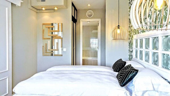and invites you to immerse yourself in a deep tropical forest, in which the "cage" lamps with wooden bars, enclose edison bulbs that only let out their best light. Mirrors lost in wooden mazes, tables that convey the strength of the tree trunk ... the elegant design of nature is imposed while the sun shines through the window. The ensuite bathroom has a bathtub, the relaxing option to enhance all our vanities.