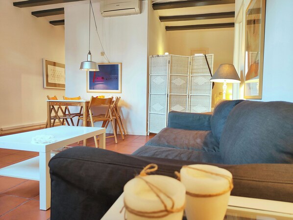 - Bright living room with sofa, dining table, TV & auxiliary table