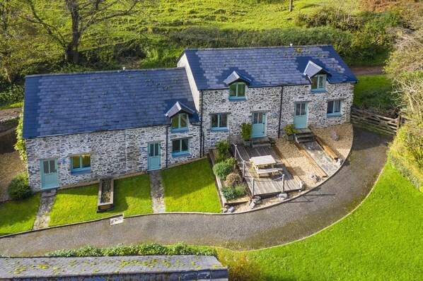 One of three properties in this lovely wooded valley location, this mid-terrace cottage combines original features with all the contemporary must-haves for a memorable break in the North Devon countryside. Together-time is the focus here, with a good-sized open-plan living space providing somewhere to unwind, cook and dine in home-from-home comfort. Snuggle on the sofa with your favourite movie on the TV, or pair-up the Bluetooth speaker for music while you perform culinary magic in the kitchen area – if you bring a pet, he’ll be able to keep a close eye on all that’s happening! Steep open-tread stairs lead to the first floor where the peaceful double bedroom has a vaulted ceiling with feature beams and lovely country views; the adjacent bathroom has the same structural features. Your living space extends to a private front garden area, and there’s access to additional shared gardens with grassy areas. An external utility room is shared with the two other holiday properties here, which can be booked separately for a bigger-group getaway.
