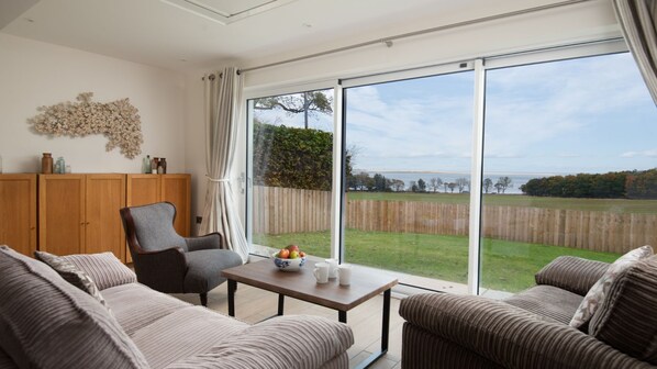Large open plan sitting room/dining area with comfortable sofa and armchair set around an integrated living flame gas fire which adds both warmth and ambience to the room. Wall mounted Smart TV. A further sofa and snuggler chair are positioned in front of the large three-panel glazed sliding doors to take advantage of the views across the coast. Dining space with seating for eight guests. Bookcase with a number of books and games. This room benefits from a climate control/air conditioning unit.