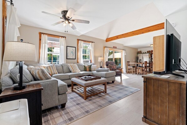 On Great Pond's shores, Driftwood Cottage offers a serene retreat with abundant natural light and lake views. Enjoy the spacious deck, fully equipped kitchen, reading loft, and cozy atmosphere that invites relaxation.