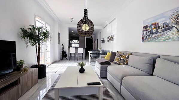 Living room with Smart TV The living room is the perfect place to relax after a day of exploring. Equipped with a comfortable sofa and a Smart TV, you can watch your favorite series and movies in a relaxed atmosphere. The dining area is next to the living room, offering a spacious and cozy space to enjoy your meals with family or friends. With air conditioning throughout the apartment, you can maintain the ideal temperature throughout the year, whether in summer or winter.