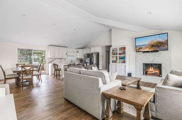 Rocky Gap’s living area is open and welcoming, with vaulted ceilings, wood floors, and a beautiful fireplace at its center. The kitchen sits just beyond, with a central island, full-size appliances, and sliding glass doors that open directly to the back deck. Whether you’re making a quick breakfast or gathering after the beach, the layout offers a natural sense of connection throughout the social spaces.
