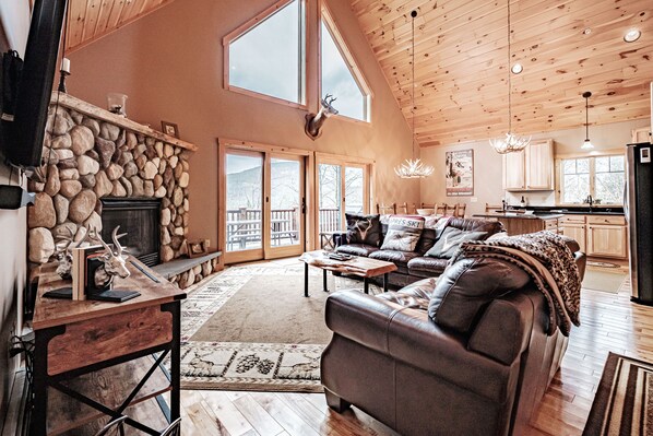 Tucked away off the Sunday River access road, this charming log chalet offers sweeping mountain views through floor-to-ceiling windows. With an open concept living area and a cozy fireplace, you can unwind in style while enjoying the game room with foosball and air hockey or relax in the outdoor hot tub.