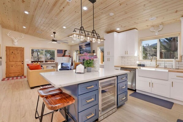 Gather, Dine, Celebrate: The open layout is perfect for making memories. Food lovers will appreciate the fully-equipped kitchen with stainless appliances and oak cabinets. Our rustic log dining table is ideal for communal meals, and a wine fridge keeps your beverages chilled for any celebration.