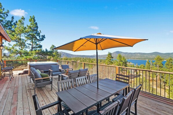Outdoor dining - Grand Views: Views of the Entire Big Bear Valley! Luxury! HOT TUB! PET FRIENDLY 🐾Game Room! Theater! (Big Bear Lake)
