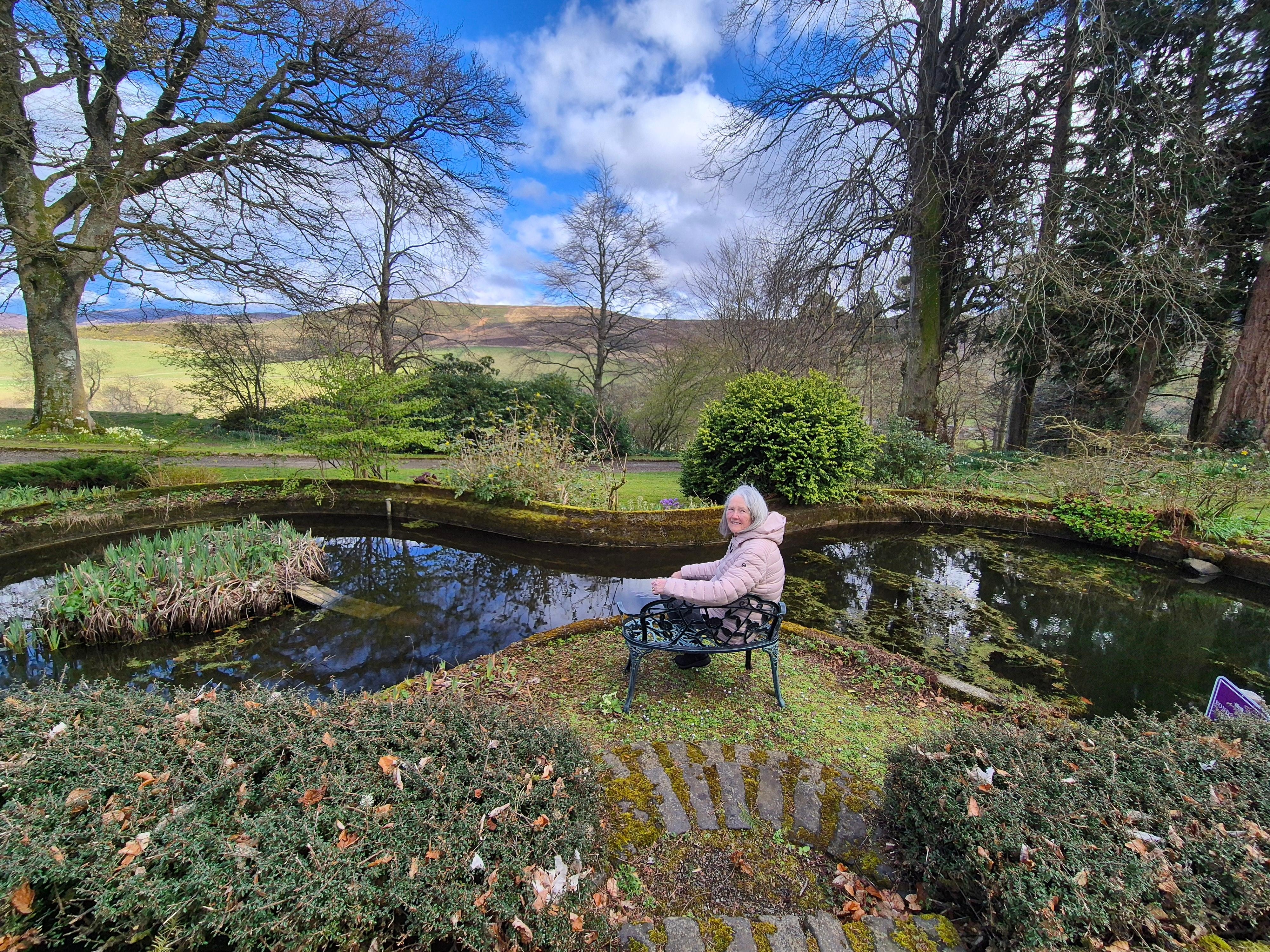 The cottage courtyard features seating, a hot tub, BBQ, and manicured lawns. A flat lawn is ideal for games and overlooks a scenic pond, while the south lawn provides a peaceful spot for morning coffee with views of the glen. A grass path links the Quarter House to the Holms Water picnic area and surrounding trails. Seasonal blooms—snowdrops, daffodils, primroses, rhododendrons, and hellebores—enhance the gardens year-round.