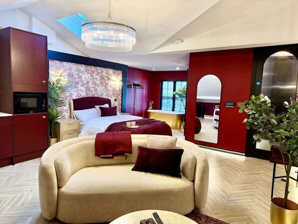 A romantic, design-led retreat in the heart of the Jewellery Quarter. This chic apartment features rich burgundy tones, warm gold accents, and soft ambient lighting throughout. Unwind in the plush double bed, relax in the stylish living space, or indulge in the statement freestanding gold bath for the ultimate evening escape. Finished with a sleek walk-in shower and moments from bars, cafés, and restaurants, it’s the perfect hideaway for a memorable city break.