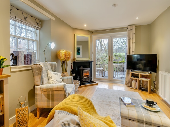 Living room: TV, Sky, Amazon Prime, Netflix, Woodburner, French Doors Leading To Decking