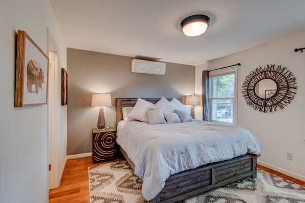 The Wander Inn offers three great bedrooms. On the second floor, one story up from the ground floor, you'll find a King suite with private bathroom, and a second King suite. At the top, on the third floor, you'll find the third bedroom with a Queen bed and a twin daybed with trundle.