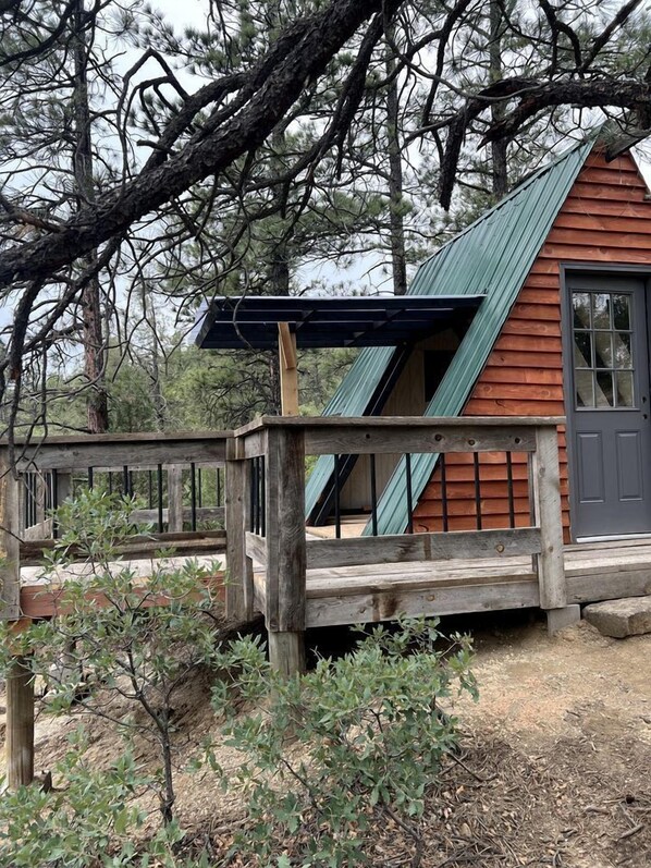 Escape to Peaceful Peaks Glamping and experience the tranquility of nature in our Convertible A-Frame Cabin. This rustic yet modern cabin offers stunning views of the surrounding mountains. Retreat and wake up to the beauty of nature. Enjoy a spacious deck, and nearby hammocks. Book your stay now for a unique and unforgettable experience.