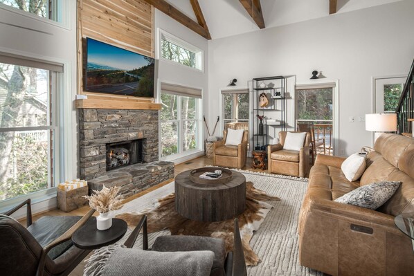 The main level welcomes you with a spacious great room featuring soaring vaulted ceilings, exposed beams, and a stone gas fireplace. Comfortable seating and a Smart TV make it the perfect place to unwind after a day of exploring. Large windows and glass doors frame spectacular layered mountain views that bring the beauty of the Blue Ridge right into the living space.