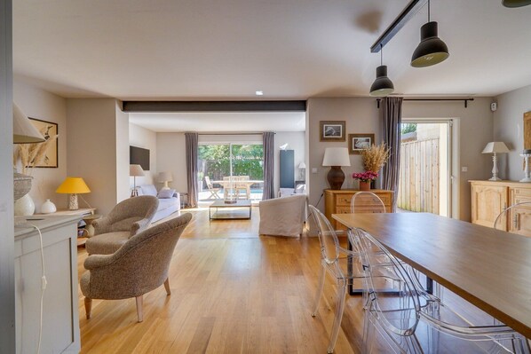 - 1 large living room with dining area and view of the terrace - 1 semi-open, fully equipped kitchen, - 4 bedrooms upstairs (1 Queen bed, 2 double beds, 1 Single bed) - 3 bathrooms - 3 bathrooms - 1 swimming pool - 1 parking space