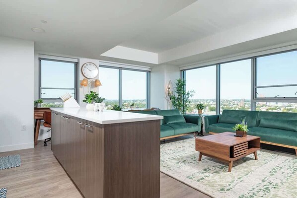 Step into the captivating open living area, where the city skyline views unfolds through expansive windows, a mesmerizing backdrop to the inviting array of stylish sofas. Sink into the plush cushions and let your gaze wander into the distance, setting the scene for an impeccable stay. As the sun sets after a day of local exploration, find solace on the sofa, tuning into your favorite shows on the generous HDTV, preparing to unwind and embrace the tranquility of the evening.