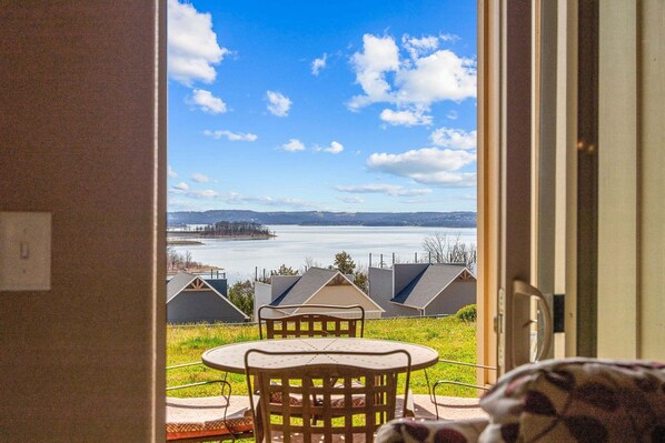 🌟 This luxurious two-bedroom walk-in condo offers stunning Table Rock Lake views from its all-season sunroom and private covered patio. Inside, the open-concept layout includes a modern full kitchen, a dining area, and a comfortable living room with cable TV and a sofa bed — the perfect place to gather, relax, and enjoy time together.