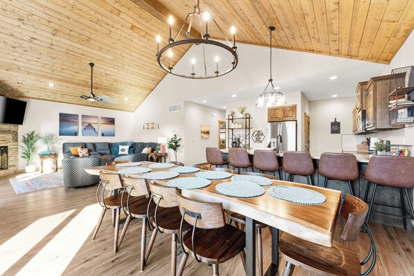 Spacious great room with fireplace and a fully-equipped kitchen for group meals.